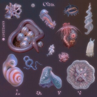 Larv je intimni dnevnik prihodnosti, ki ga gibljeta voda in nenehne spremembe. Človek kot vodno telo – tekoč, prepusten in dovzeten za notranje plimovanje – je sestavni motiv kompozicij, ki se nežno razvijajo skozi drseče glasove, hrusteče terenske posnetke, modulirane elektroakustične vzorce in sintetične glitch-ane tone. Nepopolnosti, artifakti in nestabilnost niso skriti, temveč zaobjeti, saj zvenijo kot sledovi povezanega telesa v pretoku. Z raziskovanjem in učenjem lahko vodno telo postane telo tihega upora, ki komunicira s spreminjajočimi se stanji.